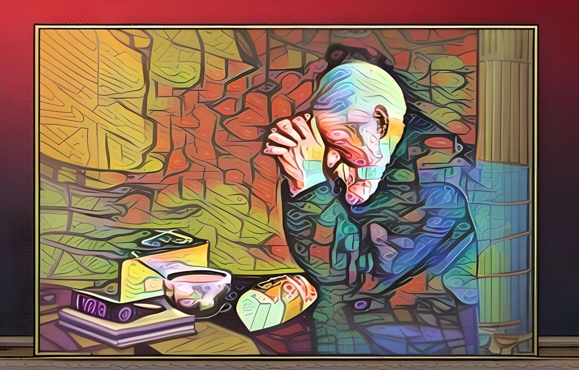 This artwork features a stylized, abstract depiction of an elderly figure seated at a table with hands clasped in prayer over a modest meal. The composition blends geometric shapes and vivid, fluid colors — blues, oranges, and greens — to create a sense of both serenity and reflection. The image evokes themes of gratitude, simplicity, and inner peace, rendered in a modern, mosaic-like style.